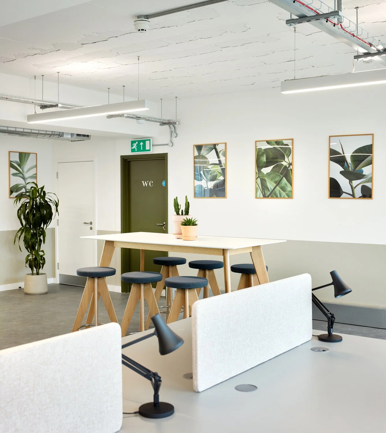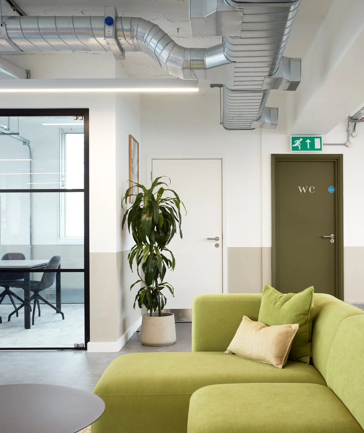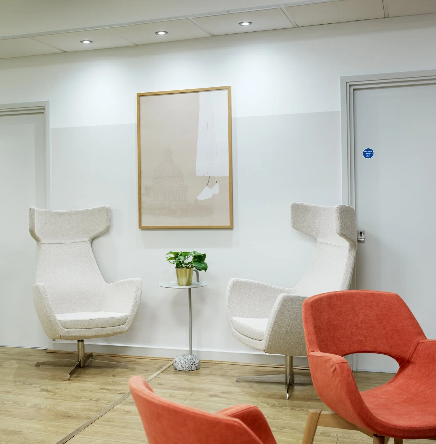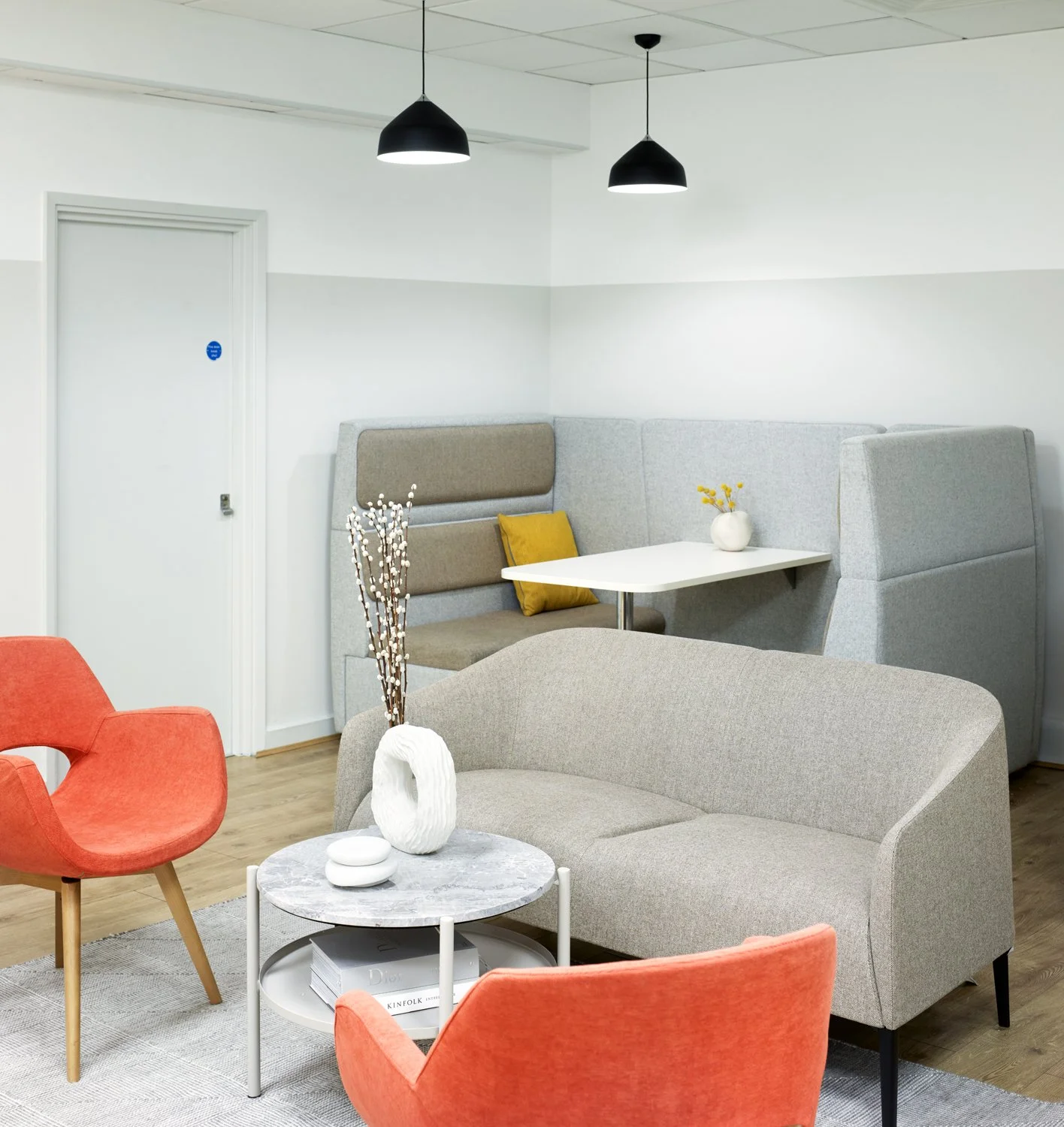 Light-touch Smithfield refurbishment of communal areas, breakout spaces and offices, using soft palettes, curated furnishings and reupholstery to create a cohesive, inviting environment.