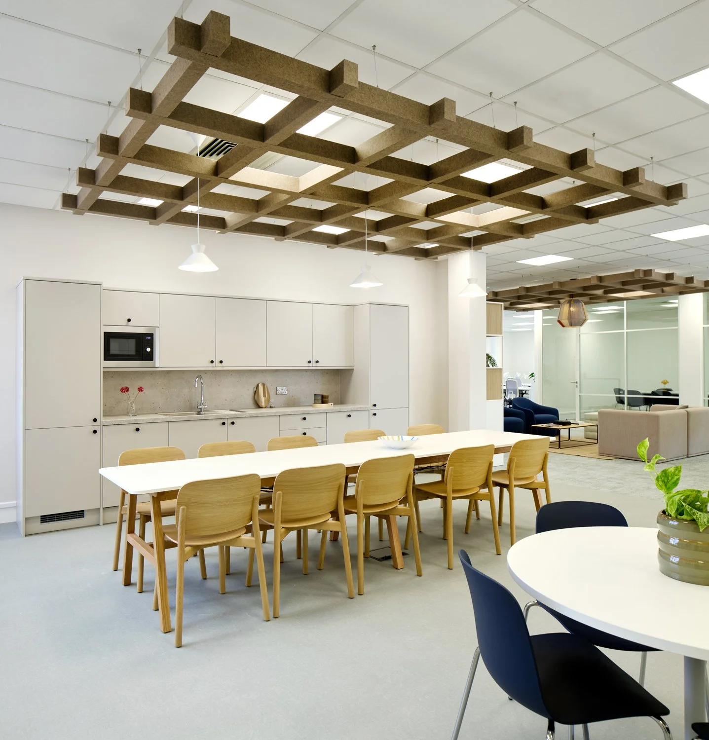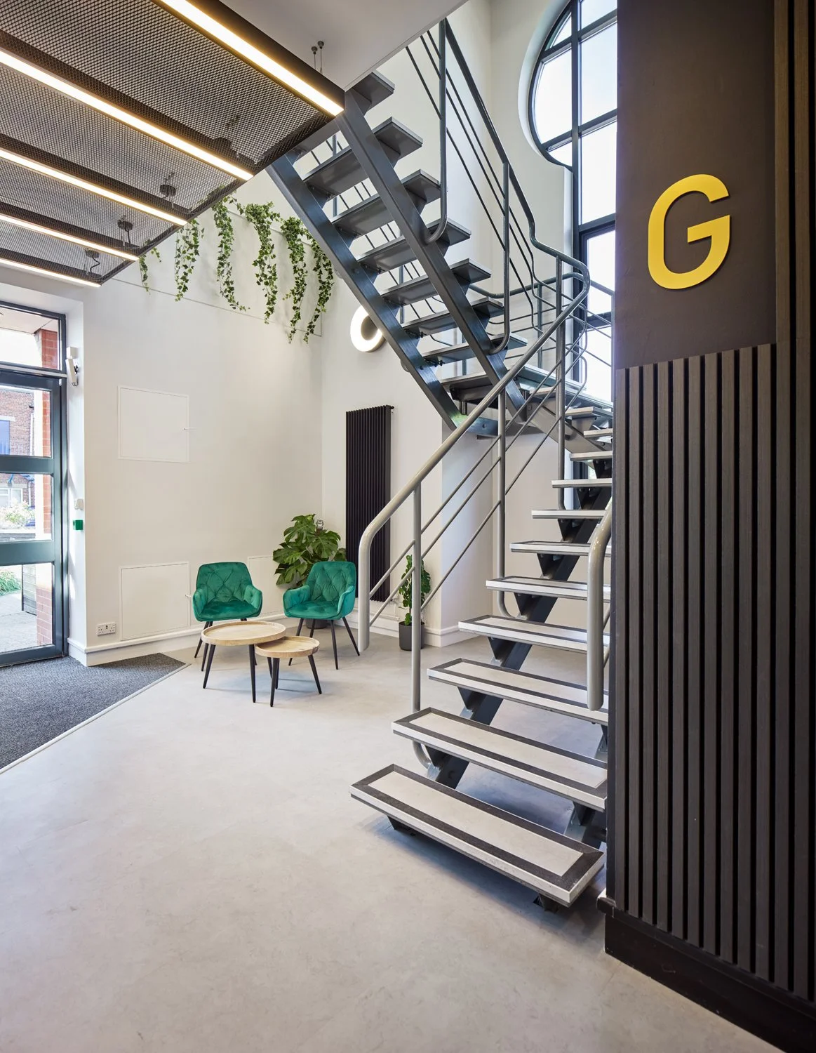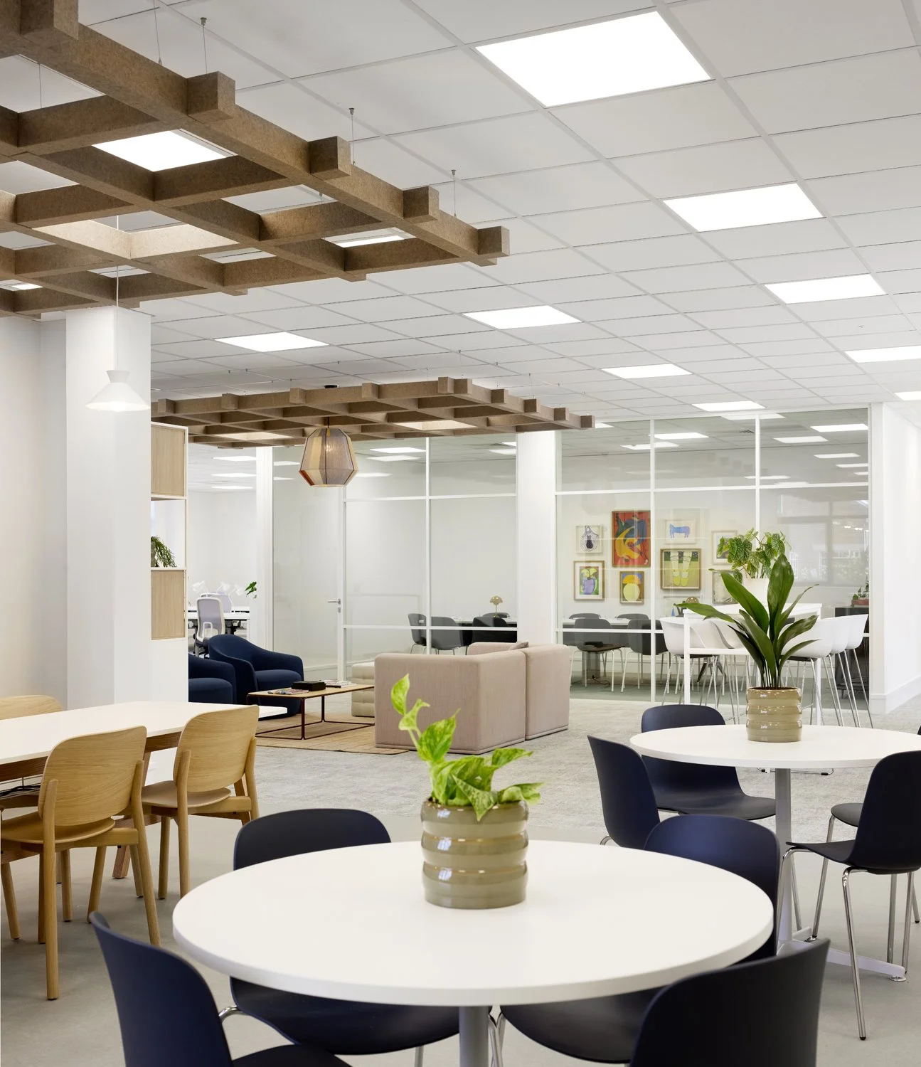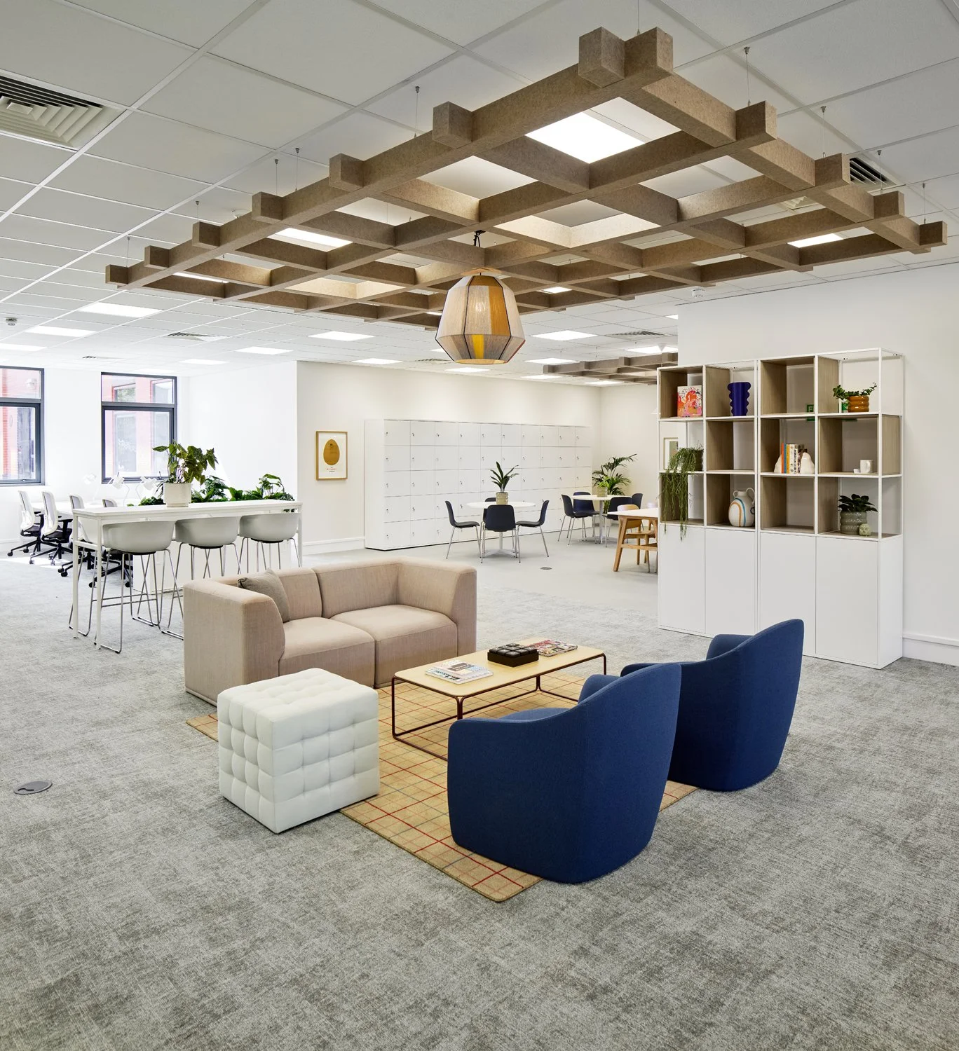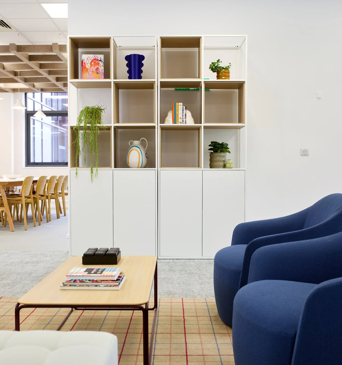 A restrained base palette was layered with carefully selected furniture, planting and accessories to define work, meeting and breakout zones. Bespoke artwork by Ben Connors adds colour and identity, bringing character into the space without overwhelming it. The result is a balanced, flexible office that feels professional, welcoming and easy to adapt over time.